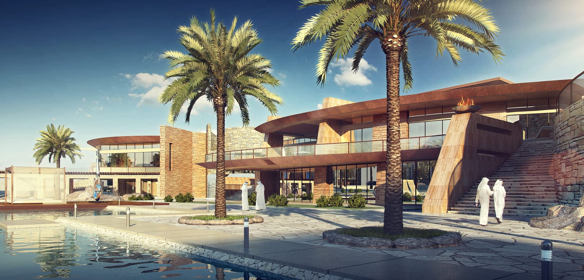 VIP Luxury property spread on an expansive plot of land in a contemporary theme, yet integrating with natural surroundings, achieved by a selection of natural stones and timber elements throughout the facades. The interior design was done in a way to integrate the new modern theories with the traditional stone cladded direction.